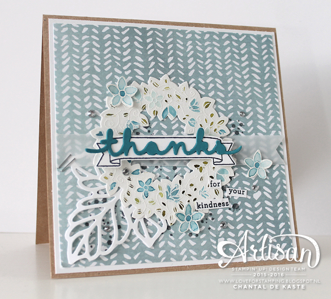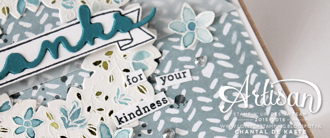 (For the English readers, there is a translate section on the top of the right sidebar) Hi! Nice to see you come take a look at our Artisan Design Team Blog Hop! As you are accustomed to, there is every two weeks, a hop that you can follow. Today, it is with me in the character of a real ‘spring’ card. Outside the storm, the sun is already been well and the clock has now been rescheduled for the summer time. So I have the “flowers” but again caught out of the closet … It has become a busier card than what I’m used myself. It may come from the fact that I’ve worked with DSP as background instead of a white background which I often use. But I find this English Garden DSP so much fun! The overflow of the blue from light to dark certainly has a nice effect. I’ve decided to keep the card more quiet and work only in white and blue tones.
