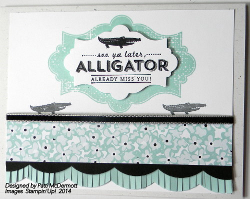 This little guy you won’t see for a while because it is from the new BIG catalog to be released in July 2014. One of our gifts from SU at Leadership was this stamp set called “So very Happy”. However, all of the embellishments are from the Occasions catalog. The wooden triangles can be found on page18, the Retro Fresh Designer paper is on page 19, and the triangle punch can be found on page 26. Sentiment is from the Geometrical stamp set, also on page 26.